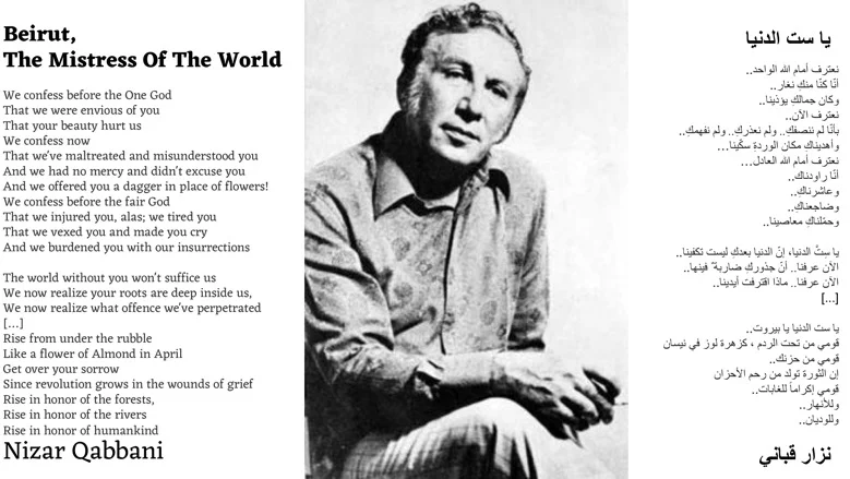 Syrian born, Nizar Qabbani (1923-1998) chose Beirut as a life partner, calling the city «The Mistress of the world». Considered with Mahmoud Darwish as one of the most talented modern Arab poet, his work mixes love, women and Arab nationalism.